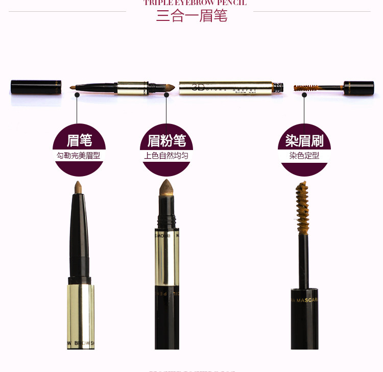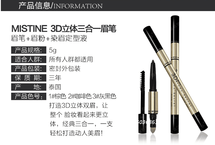 【产品名称】:泰国NO1.Mistine创新彩妆 3D眉笔+染眉定型膏+眉粉