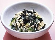 (1)えのきだけ1袋は石づきを取り、ほぐしてさっと湯通しする。(2)ほうれん草は塩少々を加えた熱湯でゆでて水にとり、水気をしぼり長さ3cmに切る。(3)(1)と(2)を合わせて、「キユーピーノンオイル和風ごま」適量をかけて、ちぎったのり1/4枚を散らす。