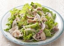 (1)豚肉(しゃぶしゃぶ用)50gはひと口大に切り、沸騰直前のお湯でさっとゆで、水にとって水気をよくきる。(2)玉ねぎ1/2個は半分に切り、繊維に直角に薄切りにし、水にさらして水気をきる。(3)器にリーフレタス1枚を敷き、(1)、(2)、水でもどしてさっとゆでたひじき(乾燥)15gを盛りつけ、「キユーピーノンオイル和風ごま」適量をかける。