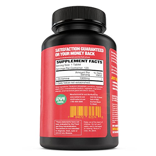 -. Title : Raw Barrel's - Pure L Glutamine Tablets - EXTRA STRONG 1000mg Per Tablet - SEE RESULTS OR YOUR MONEY BACK - 120 Pills - With *FREE* Digital Guide