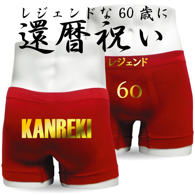 還暦パンツは父母の還暦祝いプレゼントに!レジェンドな60歳に!ちゃんちゃんこはもう古い! 赤いボクサーパンツをご両親にプレゼントしませんか?豪華金文字でデザインされています。伸縮性の高いナイロン素材は男女共に着用できるユニセックス(男女兼用)タイプです。ちなみに、うちの親父は、真っ赤なちゃんちゃんこは死んでも着てくれませんが、ボクサーパンツなら、なんだかんだ言っても、ちゃんとはいてくれました(笑)