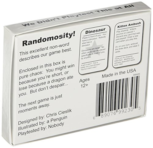 -. Binding : Toy -. Brand : Asmadi Games -. EAN : 0885674623867 -. Feature : For 2-15 players / Takes 1-5 minutes to play / Great party game -. Genre : party -. IsAdultProduct : 0 -. ItemPartNumber : ASMWEQ1 -. Label : Flat River Group -. Manufacturer : Flat River Group -. Model : ASM SA01 -. MPN : ASMWEQ1 -. PackageQuantity : 1 -. PartNumber : ASMWEQ1 -. ProductGroup : Toy -. ProductTypeName : TOYS_AND_GAMES -. Publisher : Flat River Group -. Studio : Flat River Group -. Title : We Didn't Playtest This at All - With Chaos Pack -. UPC : 783719963278 -. Warranty : No Warranty
