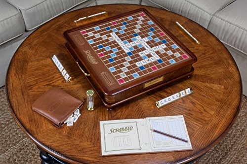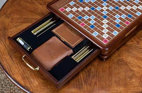 -. Feature : Elegant two-tone wooden cabinet with burled wood veneers / Rotating faux-leather game board with raised grid and gold foil stamping / Integrated storage drawer / Plated die-cast tile racks and timer / Urea tiles and deluxe scorebook