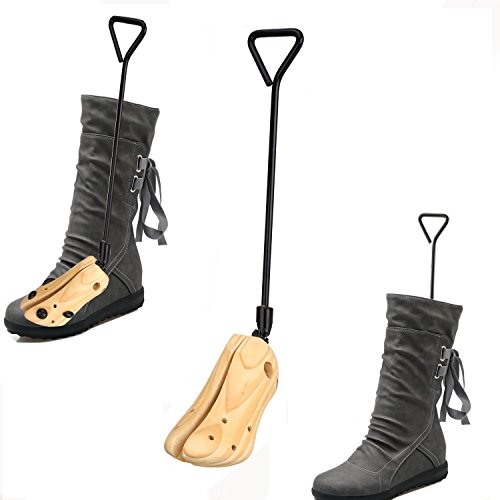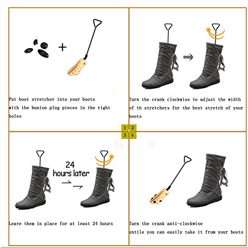 NOTE: This device only stretches the width of your boots, not the length. USAGE: ● Can be used to stretch width of the boots; ● Keep your boots in shape and prevent wrinkles from appearing; ● Absorb moisture and odor, helping create a dry and healthy environment for your boots, extending their lifetime. Getting away from Painful Shoes! Have you ever met these situations like: you bought many pairs of beloved boots from the stores or the internet, but they can never fit correctly. We love them to death but what we get are a pair of hurt feet after putting them on. This pair of boot stretchers can help you out of this situations!!! You will never suffer from corn or bunion owing to the tightness shoes. Get a more comfortable fit with this pair of wood boot stretchers. The stretchers are used to stretch the width of all knids of boots and other tight-fitting shoes, helping to get rid of bunions, corns, hammertoes. Bearing No More Pains In Shoes. They can also be used to stretch new shoes, shorten the painful break-in period. With them, you can transform any pair of boots into perfectly fitting, comfortable shoes. Targeted Relief pods Included 8 removable pressure relief plugs are also included, helping to stretch targeted areas of your boots. STEPS I- Insert stretchers into your boots : Put boot stretchers into your boots with the bunion plug pieces in the right holes. Ⅱ- Width Stretch : Turn the metal crank handle in clockwise direction until you begin to see surface pressure showing on shoe. Ⅲ-Wait for the best results: Leave shoe stretcher in place for at least 24 hours.