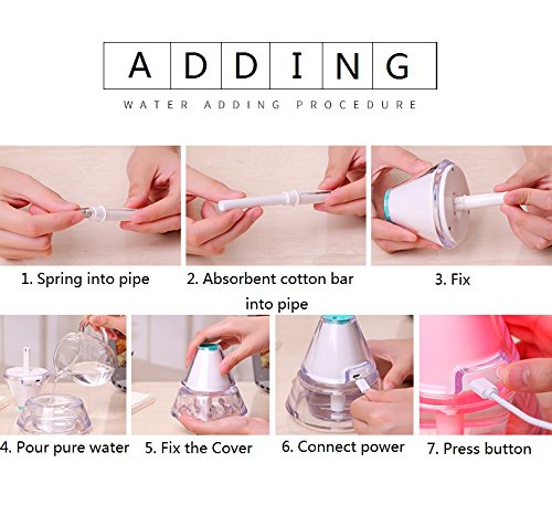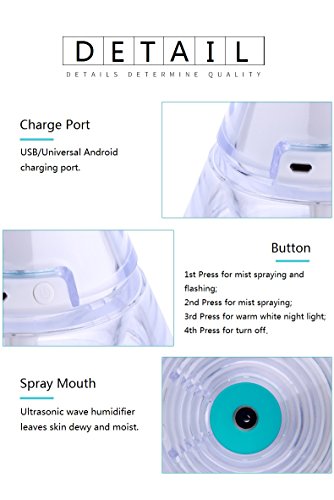 3 Modes LED: Flashing and Humidification for 1 press on the buttoun; Only Humidification for second press; Warm White Night Light for third press; Turn off for fourth