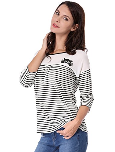 -. Title : Allegra K ボーダー tシャツ 七分袖 トップス ストライプ 猫柄 ドロップショルダー 丸首 可愛い レディース