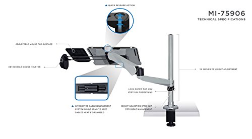 -. Feature : Functional. Mount-It! MI-75906 This single arm mount can be adjusted for sitting, standing, or laying down. Simply slide the articulating arm up the height adjustable pole and you can create a series of dynamic ergonomic positions. Plus, you can adjust its orientation and height to avoid eye strains, sun glare, back or neck pain, or accommodate display settings like contrast and brightness. This mount is ideal for business, offices, schools, dorms, homes, etc / Vented Cooling Tray. The tablet or computer tray is vented to provide maximum optimal airflow and the aluminum plate serves as a heatsink to keep your device from overheating. The vented laptop tray comes equipped with a detachable mouse pad and detachable mouse holster. You can quickly position the mouse and holster to accommodate left handed or right handed preferences. Simply pull the mounting bar to the right or the left of the tray for easy attachment / Rotatable, Height Adjustable, and Tilting. Articulating arm design with multiple pivot and swivel locations. The tray itself can tilt down 20 degrees and up 90 degrees for a total 110 degrees range for ergonomic typing and viewing angles. The articulating arm is rotatable and height adjustable. It can be adjusted in height from the pole, but it can also be adjusted on the arm from 15.5 inches from minimum to maximum heights to accommodate different orientations / Organizing. Thanks to the cable management clips hidden neatly under each arm, you will never have to worry about tangled or frayed wires. Raising your laptop above your desk will introduce whole new spaces for your work, assignments, applications, and appliances / Sturdy and Elegant Construction. This desk table mount comes with a C-clamp base for an extra secure attachment. The C-clamp base paired with the solid die cast aluminum creates a sturdy and architecturally sound structure. Its fashionable silver color scheme and modern design will assimilate effortlessly into any contemporary setting. Hardware and easy to follow instructions included