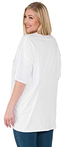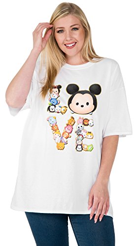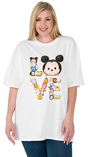 Disney plus size t-shirt with Tsum Tsum spelling out "LOVE" graphic print. Characters include: Mickey Mouse, Minnie Mouse, Donald Duck, Daisy Duck, Goofy, Pluto, Stitch, Dumbo, Bambi, Thumper, Cinderella, Winnie the Pooh, Eeyore, Tigger, Piglet, Simba, Scar, Jack Skellington, Sally, Alice in Wonderland, White Rabbit, Cheshire Cat, Toy Story Alien, Aristocats Marie, Big Hero 6 Baymax, Figaro, Lady and Tramp. The 100% cotton tee is white. The shirt has short sleeves, a crew neck and a straight cut for a unisex/boyfriend style (not fitted).Feature
