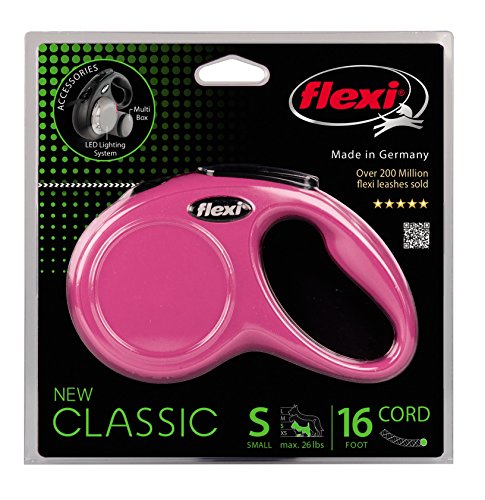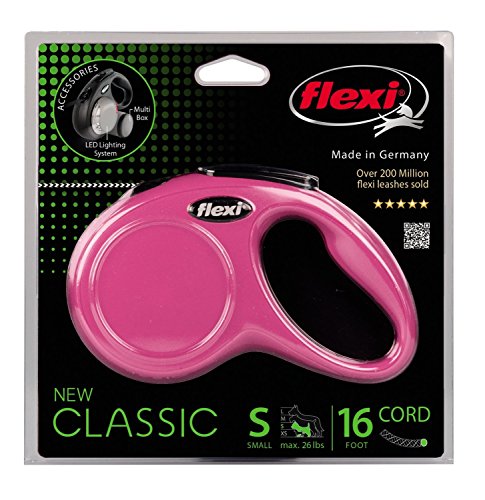 Studio : Flexi North America Publisher : Flexi North America Binding : Misc. Product Description New Classic ? the classic, perfect retractable leash from flexi, featuring a stylish design and an ergonomic grip. It can be accessorized with practical accessories like the Multi Box to store treats or poop bags and the LED Lighting System to increase visibility in the dark. With its innovative short-stroke braking system, the New Classic creates a high level of safety and comfortable handling during walks. The modern New Classic leash in size S comes with a cord length of 16 ft., includes a reflective bite belt and offers plenty of freedom of movement for small dogs up to 26 lbs. The sturdy casing with ergonomic handle is available in red, blue, black or pink. 0