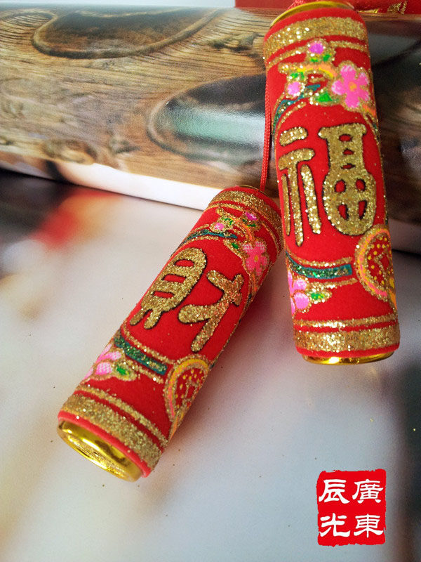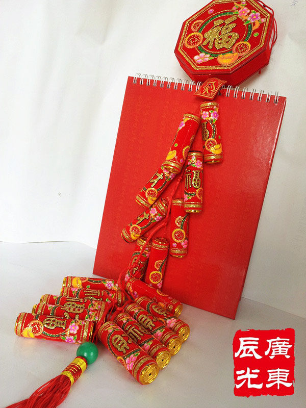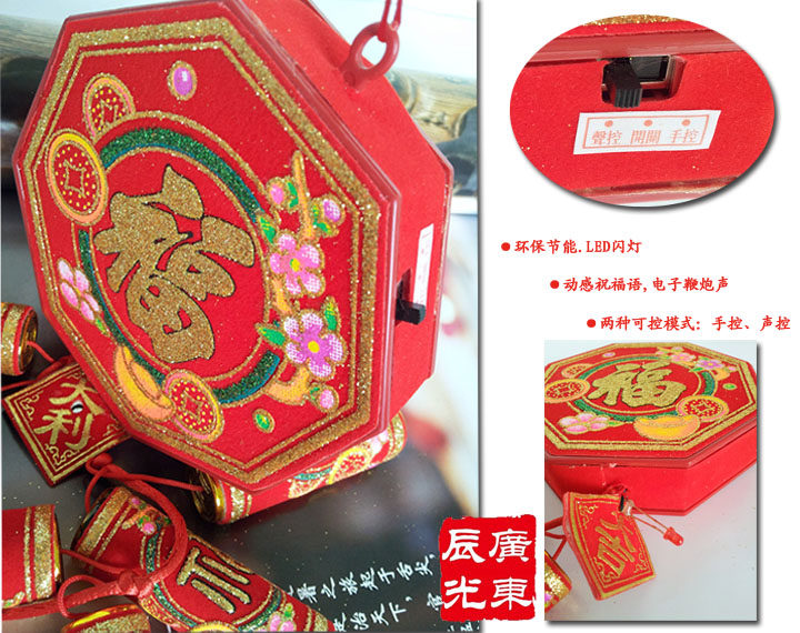 The firecrackers open panel, into the No. 5 battery switch will send electronic firecrackers sound and dynamic voice: good fortune, good luck, family peace! 2 battery powered, no external power supply, convenient and quick! (firecrackers outside the body for high-grade flocking gilding, convex on the market is not common. Glazed paper material).
