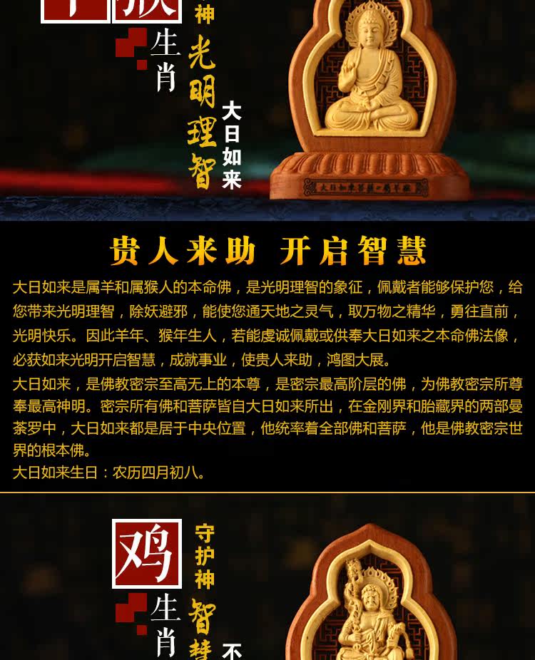 【Big Day Tathagata】 ????Big Day Tathagata is the zodiac for the "sheep" and "monkey" of the Buddha, the big day Tathagata is a symbol of light and reason, can bring to the wearer light rational, demon evil spirits, can make you through the world of Aura, take everything Essence, courage, bright and happy. Therefore, the Year of the Ox, the monkey, if the pious to wear or worship the Buddha's Day as the Buddha, will be a bright light to open the wisdom of all achievements of the cause, so elegant to help, ambitious exhibition.