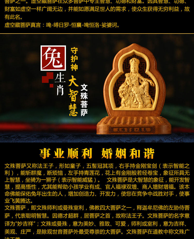????"Rabbit" is the patron saint of Manjusri Manjusri, Manjusri is a great wisdom of the symbol, can develop wisdom, improve understanding, in particular, can help children academic success, official Fulu double by business by increasing wealth by. The Buddha can bless the birth of the Year of the Rabbit people, increase creativity, development power, so that you beat the competition in the competition, so that the cause of the Apprentice. Therefore, the rabbit born, if the devout wear or worship Manjusri Bodhisattva's Dharma like, can be Manjusri Bodhisattva blessing, wisdom, so that academic career smoothly, marriage harmony, get rid of all the troubles.