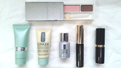 -. Feature : Brand New 6 pcs Estee Lauder & Clinique Makeup Gifts Set, starts on Nov 18th 2014. All items were freshly made in 2011 and 2012. Includes: / (1) Clinique Colour Surge EyeShadow Duo ("Single Shade from Strawberry Fudge Duo" and "Single Shade from Like Mink Duo", total 0.05 oz / 1.6 g / (1) Estee Lauder Sumptuous Bold Volume Lifting Mascara 0.1 oz / 2.8 ml + (1) Estee Lauder FULL SIZE Pure Color Lipstick *#86 Tiger Eye Shimmer" / (1) Clinique repairwear Laser Focus Wrinkle & UV Damage Corrector 0.24 oz / 7 ml / (1) Clinique Dramatically Differently Moisturizing Lotion + 0.5 oz / 15 ml + (1) Clinique Super City Block Ultra Protection 40 SPF 0.5 oz / 15 ml