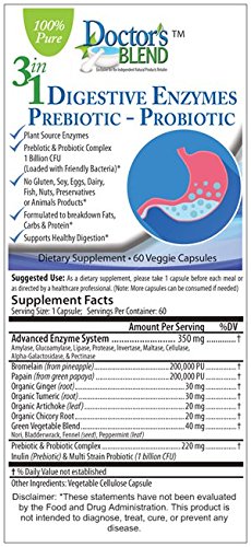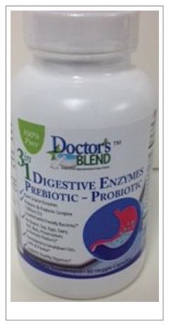 3 in 1 formula consist of Digestive Enzymes, Prebiotic and Probiotics 60 Count Digestive Enzymes are essential for normal digestive function. Together they play a vital role in the break-down, delivery and utilization of the nutrients we obtain from our diet. Along with a healthy diet and regular exercise, quality probiotic and digestive enzyme products from Doctor's BlendTM are a convenient and effective way to maintain healthy digestive function and optimize a healthy lifestyle.* Prebiotics are dietary fibers from carbohydrates that avoid absorption until they reach the colon where they are acted upon by colonic microbes, a fermentation process which is thought to promote health.* Prebiotics exist in a variety of complex carbohydrates including inulin, fructooligosaccharides (FOS), galactooligosaccharides (GOS,) and resistant starches. Probiotics are live microorganisms that may be able to help prevent and treat some illnesses. Promoting a healthy digestive tract and a healthy immune system are their most widely studied benefits at this time. These are also commonly known as friendly, good, or healthy bacteria. By supporting the intestinal mucosal function and ability to digest and assimilate nutrients, we can optimize overall health. It is critical to assess the digestive function and possible need for targeted support from digestive enzymes, prebiotics, and/or probiotics.