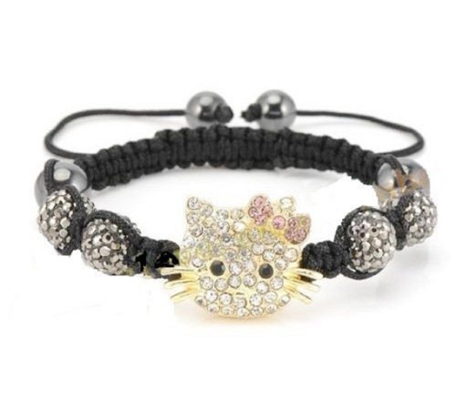 This Shamballa bracelet showcases 4 gray pave crystal balls and 4 Magnetite Beads. The central Hello Kitty inspired piece is decorated with crystals. Closure: Adjustable strand. The balls measure 10 mm each. The bracelet measures about 7 inches. Impressive and fun gift idea.Feature
