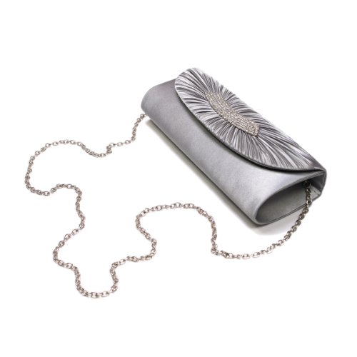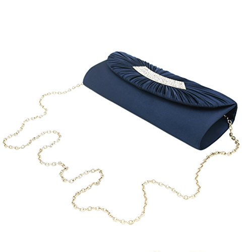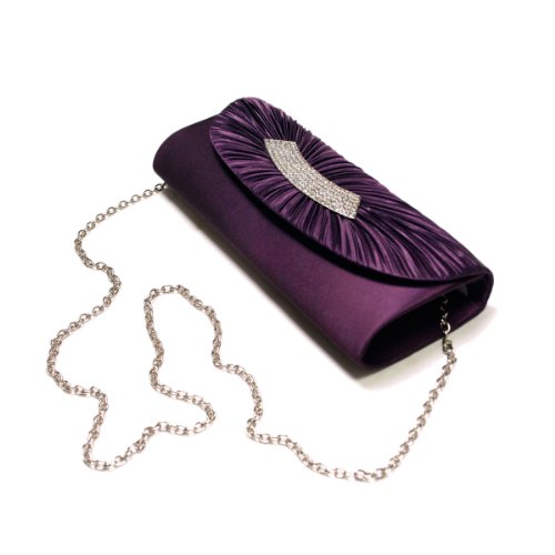 This premium quality evening clutch is both elegant and stylish. Pleated satin fabric front with sparkling crystal rhinestones. fully lined with magnetic-flap closure and inner wall pocket. Removable hideaway shoulder chain strap with 22" drop. Pretty, functional and versatile. The size is 9.5" (L) x 3.75" (H) x 1.75" (W). Elegant design and luxury feel. A must have accessory for the perfect night out.Feature