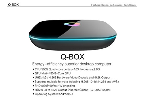 -. Feature : Built-in KODI (XBMC) fully loaded, support full HD hardware acceleration / Android TV box with Quad Core CPU, 2GB DDR3 ram and 16GB SSD storage / Android 5.1 OS with Quad-core Cortex-A53, KODI, google browser , supports millions of applications from Google Play Store, Supports OTT, IPTV online TV, online music, DLNA/UPNP network streaming / True 4k2k H.265 Hardware Video Decode and 4k2k Output, Quad Core XBMC / Kodi HD Playback. High performance Quad Core S905 CPU paired with the powerful Mali-450, 5-Core GPU, 3D GPU Graphics Processor = Insane Media Performance / Cut your monthly TV subscription and enjoy FREE Movies, shows and live entertainment from all over the world including sports. No restrictions! Forget the limitations and necessary payments by using Apple TV or ROKU!