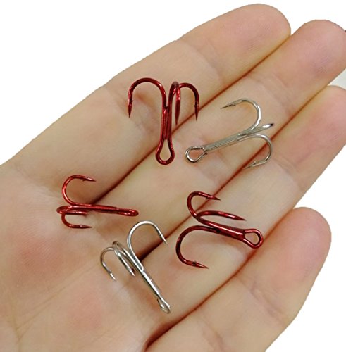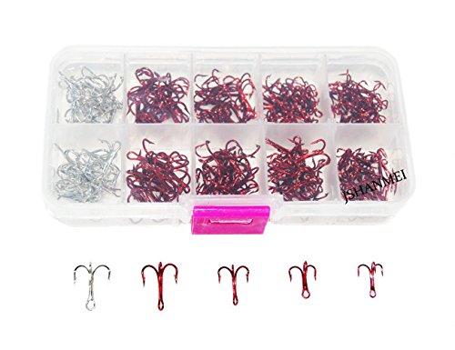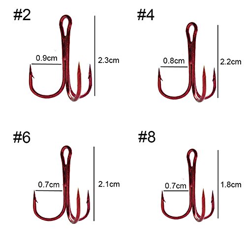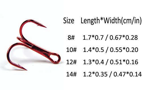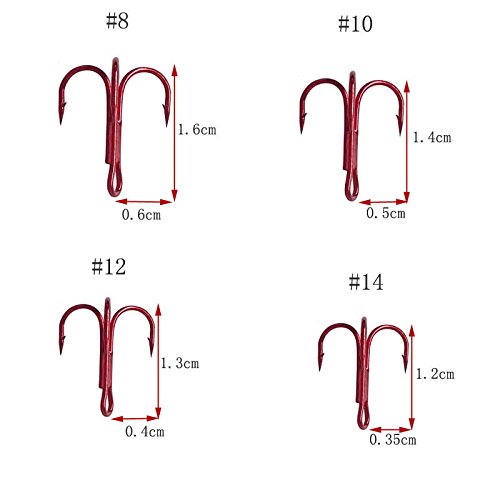 Product Description1)Strong Treble Triple Fishing Hooks. 2)Package include: 8#(silver) 30pcs 8#(red) 30pcs 10#(red) 40pcs 12# (red) 50pcs 14# (red) 60pcs one plastic box 0