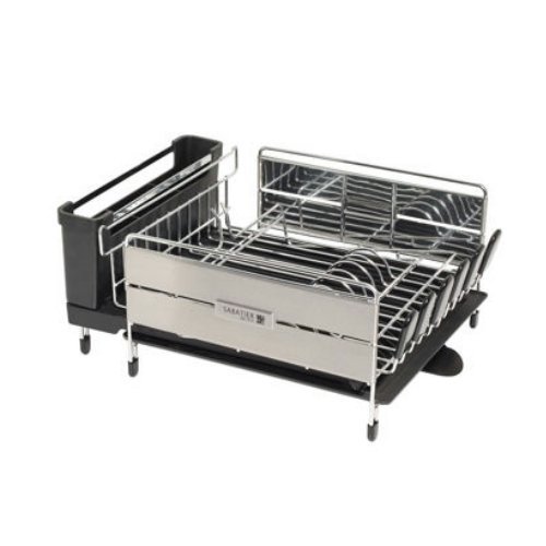 -. Binding : Kitchen -. Brand : Sabatier -. Feature : Space-saving design features expandable drain board for extra capacity. Expands from 18.5-inches to 29.4-inches / Bi-directional spout drains water into sink from any side / Removable wire stemware attachment for wine glasses, water goblets etc. Includes special feature to protect glasses from sliding off. / Flatware caddy with 3 compartments. Detach for returning items to the drawer with ease / Crafted from durable and modern stainless steel and features advanced corrosion resistant technology -. IsAutographed : 0 -. MPN : na -. PackageQuantity : 1 -. PartNumber : na -. ProductGroup : Home -. ProductTypeName : HOME -. Title : Sabatier Expandable Dish Drying Rack, 60X70-Inch by Sabatier