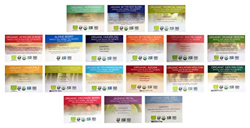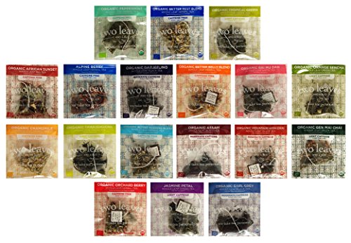 -. Feature : Sampler pack includes 36 individually wrapped gluten free, non-GMO whole leaf tea sachets. USDA organic except for Jasmine Petal and Alpine Berry. See description below for a full list of flavors. / Two Leaves Tea variety pack includes 2 of each of the following: Organic Peppermint, Organic Better Rest Blend, Organic Tropical Green, Organic African Sunset, Alpine Berry, Organic Darjeeling, Organic Better Belly Blend, Organic Bai Mu Dan, Organic Orange Sencha, Organic Chamomile, Organic Tamayokucha, Organic Better Morning Blend, Organic Assam, Organic Mountain High Chai, Organic Gen Mai Cha, Organic Orchard Berry, Jasmine Petal and Organic Earl Grey. / Discover your favorite tea and try new flavors without having to buy a whole box of each kind. Great variety pack for everyone to share and enjoy! Perfect for the home, office, or gifts. / INCLUDES 'THE CURATED PANTRY' GIFT TAG TO MAKE GIFT GIVING EASY AND CONVENIENT! / All individually wrapped tea bags are new, hand-picked and shipped loose in a box (not in manufacturer's packaging). Box style and size may vary slightly from picture. In rare cases, based upon availability certain flavors will be replaced with other flavors.