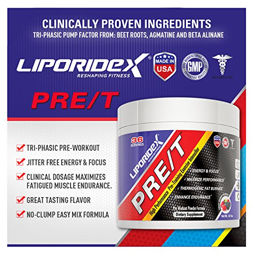 -. Title : Liporidex PRE/T Pre Workout Supplement Powder. Build Muscle, Increase Performance and Energy. Beet Root and Agmatine for Extended Nitric Oxide Release. Fruit Berry Punch Flavor - 36 Servings