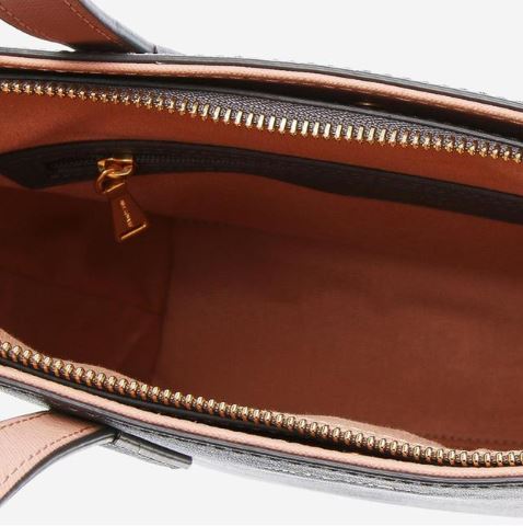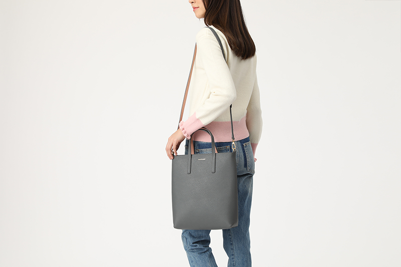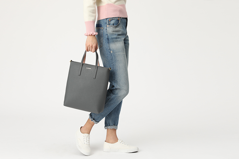 군더더기 없는 깔끔한 디자인에 골드 컬러의 로고 장식으로 포인트를 준 토트백으로, 내부 배색포인트로 세련된 외관을 연출하였습니다.