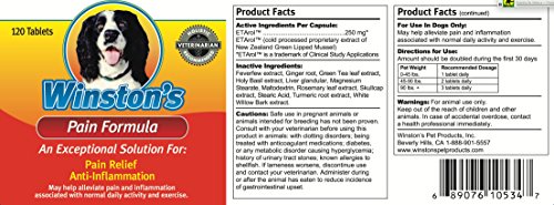 Joint pain and stiffness affect millions of dogs of all ages. Obesity, old age, and injury to the legs or joints, can cause relentless pain, and intensify arthritis and other symptoms of joint disease.Made from wholesome, all-natural ingredients, Winston's Pain Formula brings fast relief to dogs suffering from the pain of arthritis, osteochondrosis (OCD), hip dysplasia, ligament tears, and other degenerative hip and joint problems. It begins working almost immediately to relieve discomfort, stiffness and pain throughout your dog's entire body.
