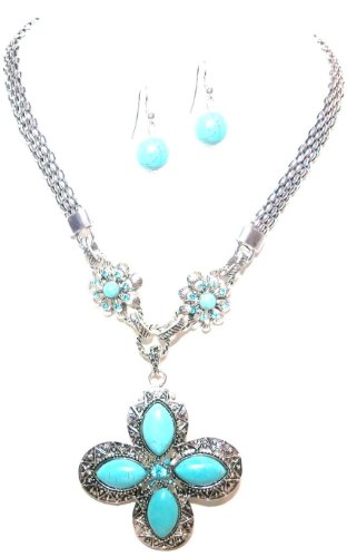 -. Title : Silver Tone Crystal & Simulated Turquoise Cross Pendant Necklace Earring Set