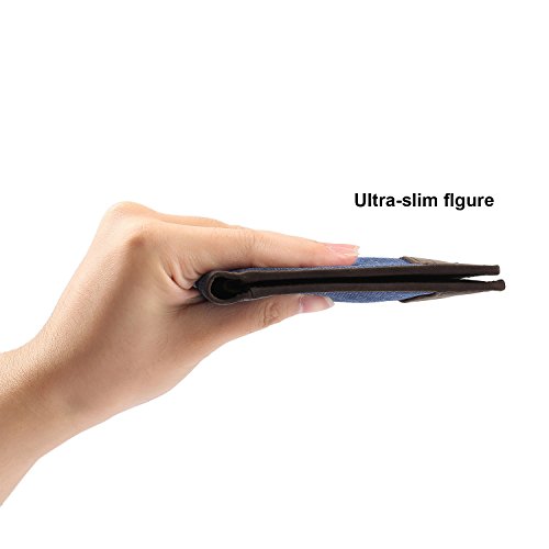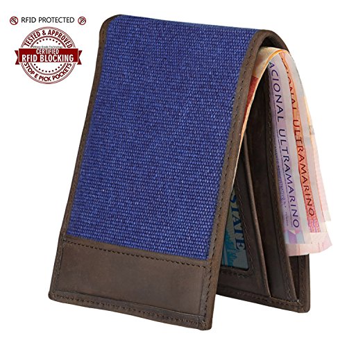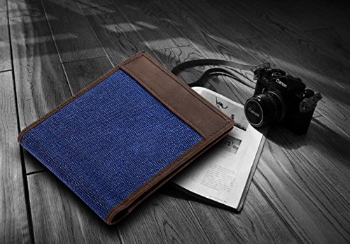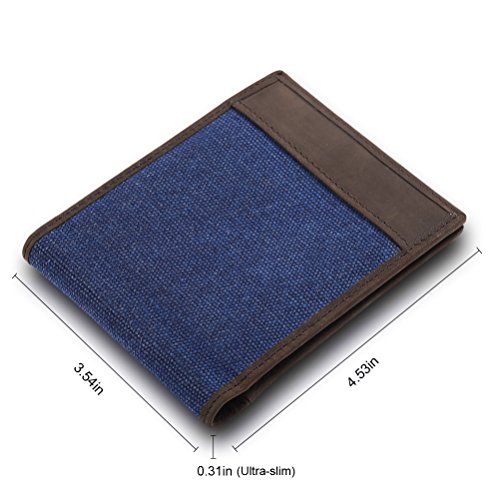 -. Feature : ✔ RFID BLOCKING, SAFETY, P.R.IVACY, effectively protect your credit cards, no worry for unsafety in crowds / ✔ Made by genuine cowhide leather, combined with dense canvas, soft comfortable hand feeling / ✔ Soft polyester lining, easy to take off your cards / ✔ Structures: 4 credit card slots, 2 cash pouches, 1 ID window, 2 bill pouches. / ✔ Dimensions: 4.53 * 3.54 * 0.31 inches(L*W*T), ultra-slim, easy put into your overcoat pocket