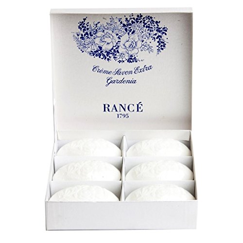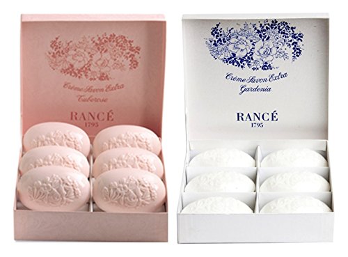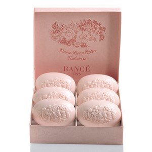 GARDENIA: This beautiful presentation features six handmade, triple milled soaps in a soft and sensuous Gardenia scent nested in a handmade box of delicate white silk moire paper with a cobalt blue overlay. TUBEROSE: Often mistaken for a rose, tuberose is a night blooming tropical plant used often in Hawaii for Leis. The scent is described as a complex, exotic, sweet, floral. Presented beautifully here in a soft pink in a vibrant pink box with fushia accents this is sure to be treasured by any woman. Some choose to use Rancé soaps to scent a room or a lingerie drawer as the fine perfumes and exceptional quality are considered the finest throughout the world.Feature