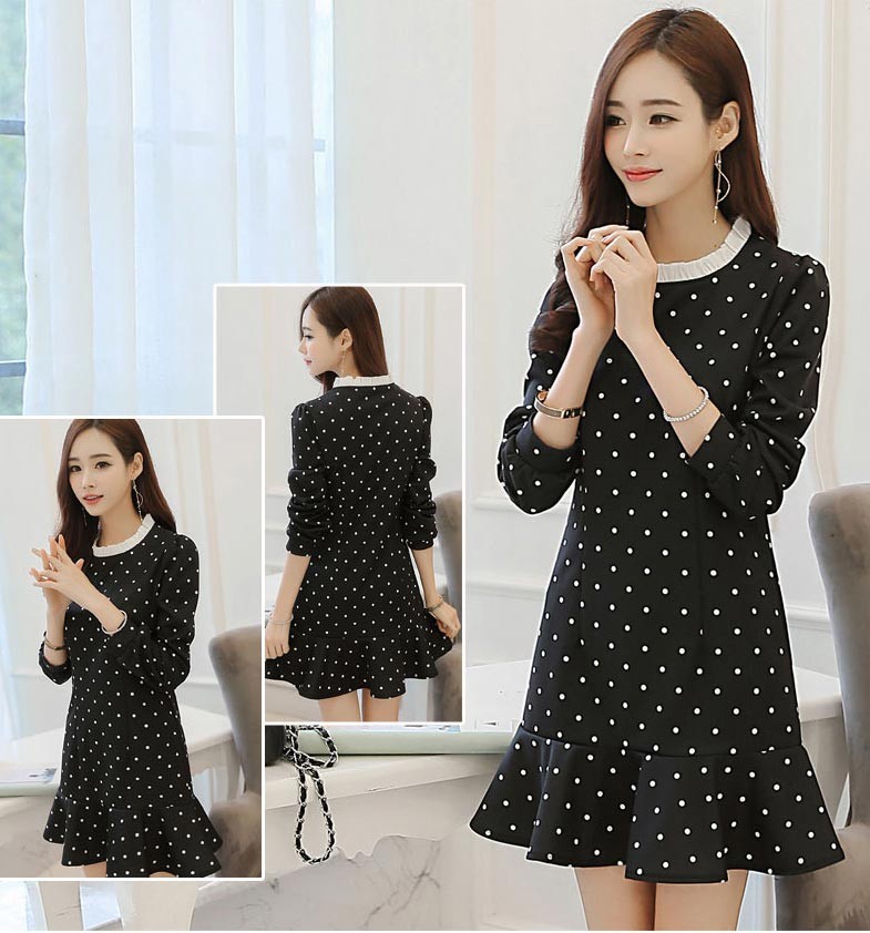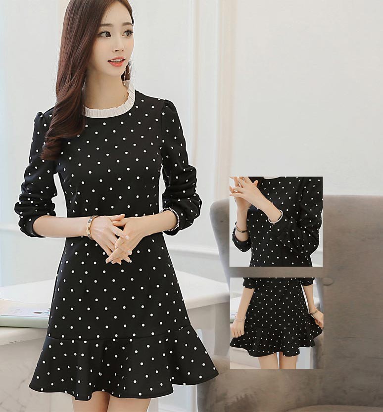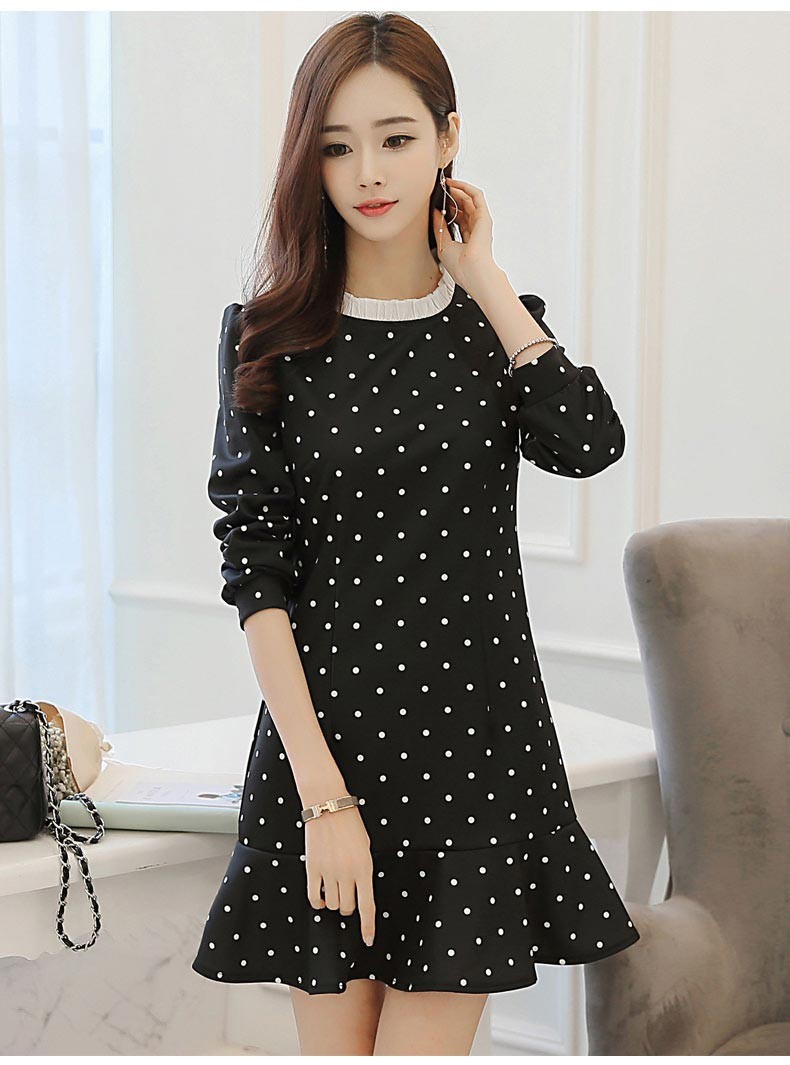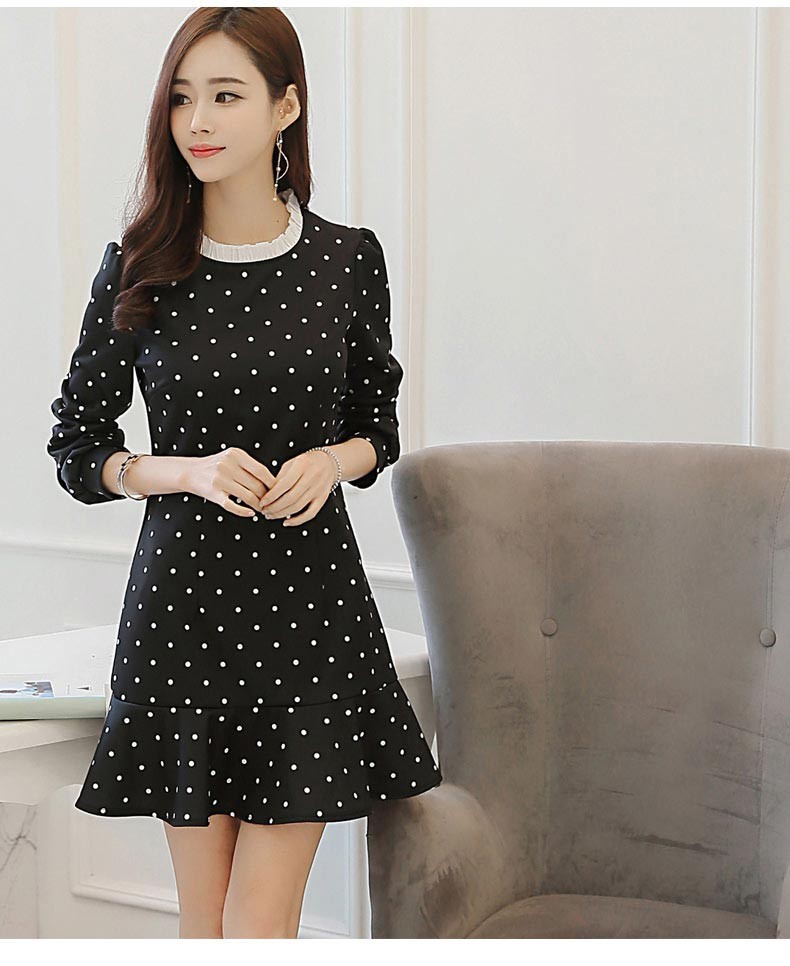 ラウンドネックにホワイトレースフリルデザインのドットプリントワンピース♪