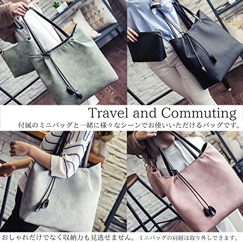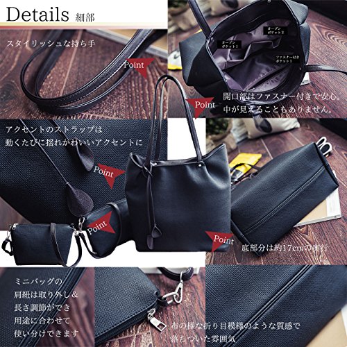 -. Feature : ちょうどいい大きさで通勤にもお出かけにも使えるおしゃれなバッグが欲しい、との声を形にしたミニバッグ付きバッグです。布のような折り目模様の質感が落ちついた雰囲気を演出。全4色をご用意。全て落ち着いた色目で大人女子にはぴったりのバッグです。しっかり奥行もあり、見た目以上に収納力があります。 / 中にオープンポケットが2つ、ファスナー付きポケットが1つ付いて、荷物の小分けにとっても便利。ファスナーをオープンにしますと、縦にA4サイズが入ります。A4ファイルは少しはみ出しますが縦に入れることができますので通勤にもお使いいただけます。付属のミニバッグは、肩紐を付けて斜め掛けや肩掛け、肩紐を外せばバッグINバッグとしても重宝します。 / おしゃれなのに収納力も見逃せません。奥行が約17cmあり見た目以上の収納力で、小旅行にもお使い頂けます。付属のミニバッグはランチや近くのコンビニに行く時や旅先で貴重品だけ持って観光にと、通勤、お出かけ、小旅行にも使えるバッグです。定番色ブラックの他にやわらかな色合いで心落ち着くカラーバリエーションがとっても魅力的。 / カラー:ブラック/グレー/ピンク/グリーン メイン素材:PUレザー セット内容:ショルダーバッグ、ミニバッグ サイズ:高さ約32cm、幅約34cm、奥行き約17cm、ミニバッグ高さ約18cm、幅23cm、奥行き約7cm、ミニバッグ肩紐の長さ約58cm~約110cm(無段階で調節可能) / (エンジェルムーン) AngelMoonは、ブラウス・ワンピース・チュニック・シャツ・カットソー・セーター・カーディガン等のレディースファッションをはじめ、ショルダーバッグやトートバッグ・ビジネスバッグ・リュック・バッグ・インバッグ・マザーズバッグなど、レディースバッグやメンズバッグから、ユニセックスバッグなど男女問わずにお使いいただける鞄や、トレンドを押さえた雑貨を取り揃えております。