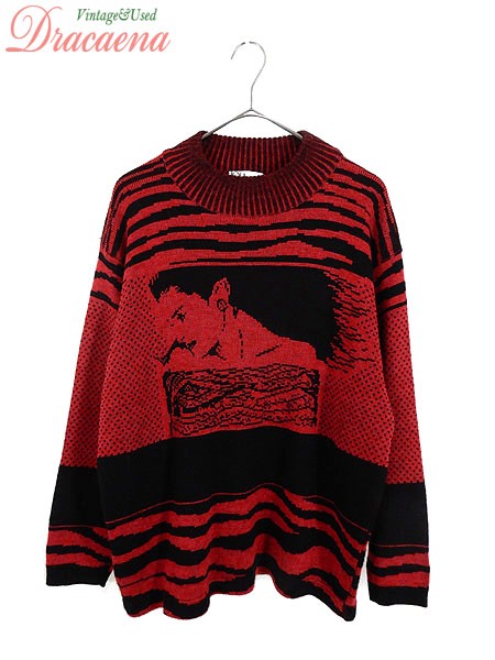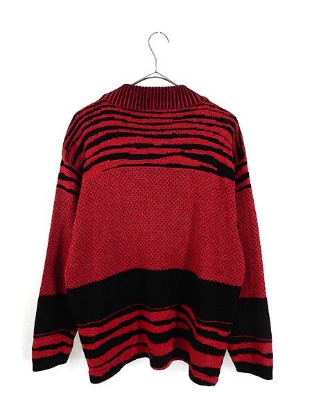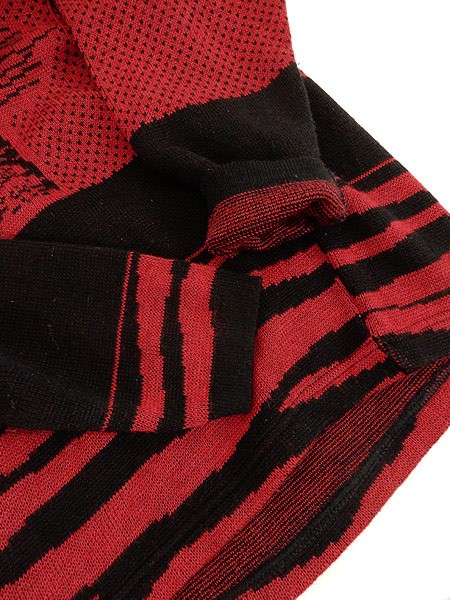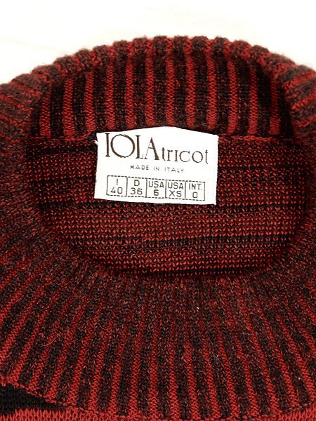 Ladies ブランドIOLAtricot カラー赤・黒 メール便不可 コンディション★★★ 素材表記はありませんが、アクリルかと思われます。 表記サイズXS スタッフコメント女性の横顔、ゼブラ柄、バードアイ、盛りだくさんなITALY製のニットです。 ※生地に若干の使用感(毛羽立ち)があります。 実寸サイズ 着丈 65 cm 身幅 52 cm 肩幅 51 cm 袖丈 51.5 cm ※ウエスト・ヒップ以外は平置き採寸