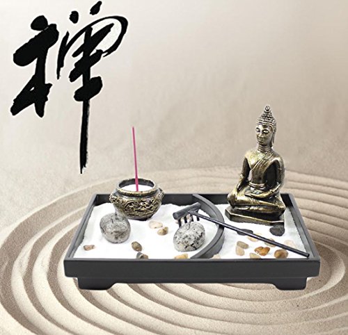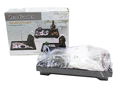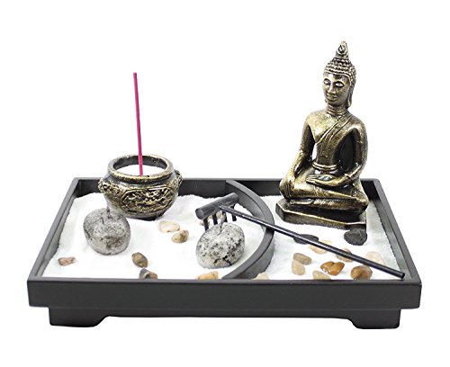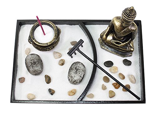 This Tabletop Zen Garden come with 10 pieces: a bag of rock, a bag of incense, a incense burner, two candle, two bag of sand, a rake, a Buddha statue and a base.