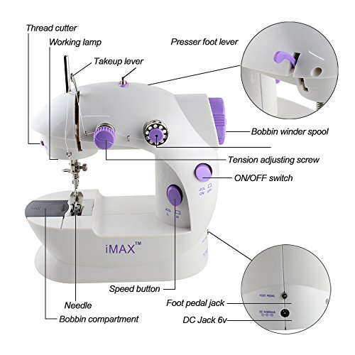 -. Binding : Office Product -. Brand : Imax -. Feature : Mini 2-speed sewing machine offers double thread and perfect stitch control / For anything from silk to denim; hand switch or foot pedal to start / Top drop-in bobbin ensures easy threading; automatic thread rewind / This Miniy Sewing Machine is small and portable, with easy-to-use features. / The design of this mini sewing machine is chic and classic and does not look out of place in your room -. Label : G1 -. Manufacturer : G1 -. PackageQuantity : 1 -. ProductGroup : Art and Craft Supply -. ProductTypeName : ART_SUPPLIES -. Publisher : G1 -. Studio : G1 -. Title : Mini Sewing Machine,.