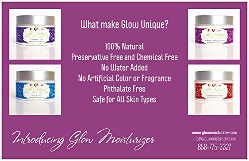 Your Beautiful Glow!Glow All Natural Moisturizers are made with therapeutic grade essential oils from France! You can choose from 3 inviting scents, Japanese Cherry Blossom, Pomegranate Mango, or Peppermint. The Aroma of these essential oils is sensuous but not overbearing. The beautiful scents perfectly mask the coconut oil so you will smell as good as you look! Our products are of the highest quality using our water-less formulation of Virgin Coconut Oil, Shea Butter and therapeutic grade essential oils. The Moisturizer with multiple benefits.