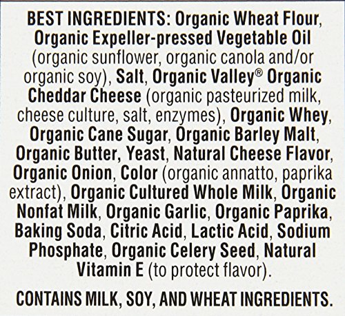 -. Feature : Pack of twelve, 9 Ounce (Total of 108 Ounces) / Certified Organic / Made with Organic Valley Cheese / No Artificial Flavors, Synthetic Colors or Synthetic Preservatives / Produced without Antibiotics, Synthetic Hormones or Persistent Pesticides; We work with trusted suppliers to source only non-GMO ingredients.