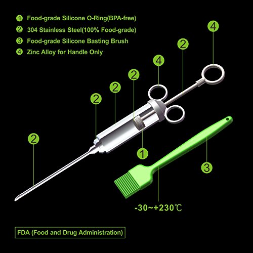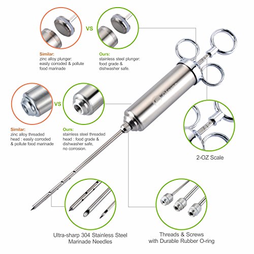Solidly Built to Last, Accompanied for Years Stainless steel turkey injector and syringe needles are very solid and durable, a little bit heavy by hand, which can accompany your family many years.