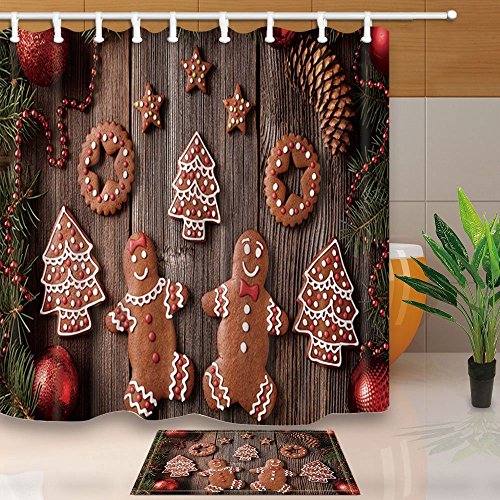 KOTOM Christmas Decor, Christmas New Year Jewelry Tree and Doll Retro Wood Board Backdrop 69X70in Mildew Resistant Fabric Shower Curtain Suit With 15.7x23.6in Flannel Non-Slip Floor Doormat Bath Rugs