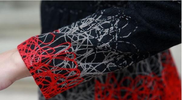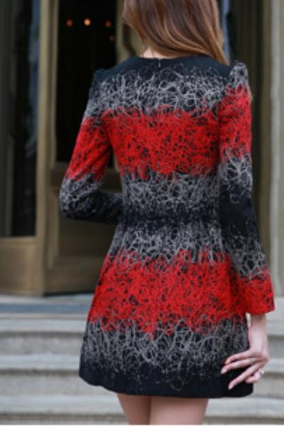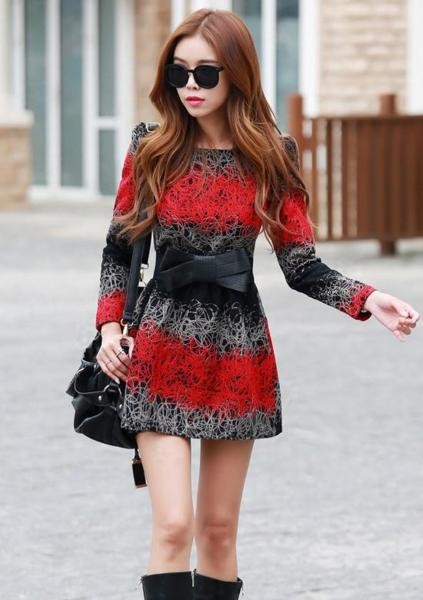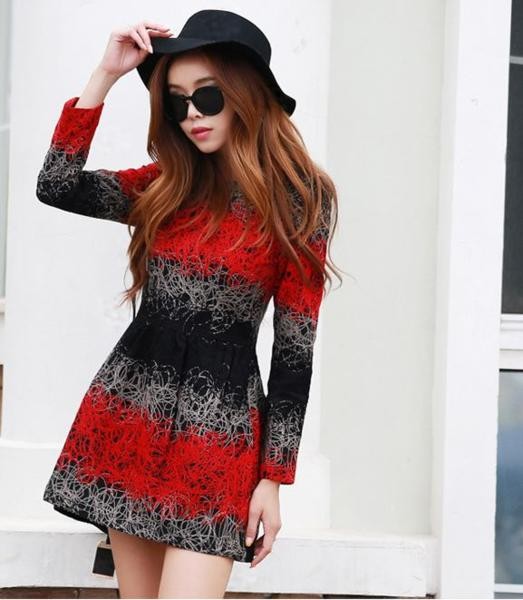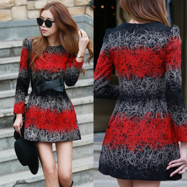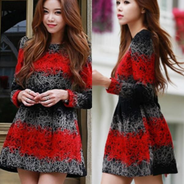 大きめウエストリボン マルチカラー長袖 Aライン ワンピース ブルー/L