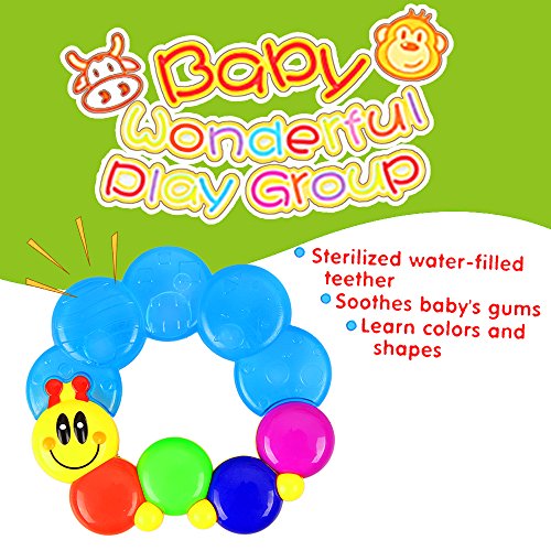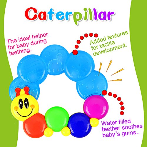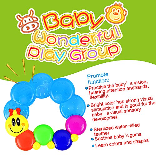 This teething rattle is especially designed to help babies during their teething stages. It features a cute and colorful caterpillar figure with soft and durable water filled teething to soothe baby's gums and gratify their chewing and biting urge during tooth emergence stages. This attractive rattle toy helps babies to improve upon their vision, hearing, attentiveness and hands flexibility abilities. The bright multicolor pattern of the toy has a strong visual appeal that is beneficial for the baby's visual sensory development. The teether is filled with sterilized water and has added textures for tactile development. It helps babies to learn and recognize different colors and shapes. It is a great toy to keep babies engaged and happy.Feature