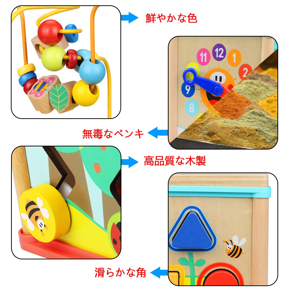 安全性について:アクティビティキューブは滑らかな縁で、無毒なペンキと素晴らしい材料で作られたおもちゃです。子供のために最も安全なデザインをしました。1歳以上のお子様に一番なおもちゃをあげます。