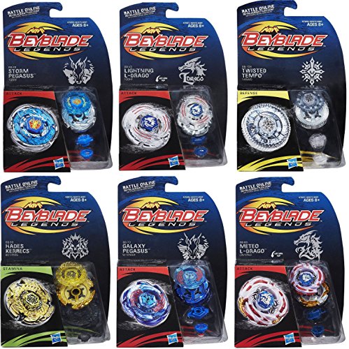 -. Feature : Beyblade Legends Tops 6 Pack Bundle Includes / BB-104 Twisted Tempo 145WD Top, BB-28 Storm Pegasus 105RF Top & BB-43 Lightning L-Drago L100HF Top / BB-99 Hades Kerbecs BD145DS Top, BB-70 Galaxy Pegasus W105R2F Top & BB-88 Meteo L-Drago LW105LF Top / Legends tops are powered by Beyblade