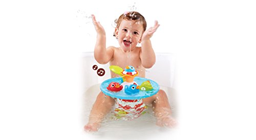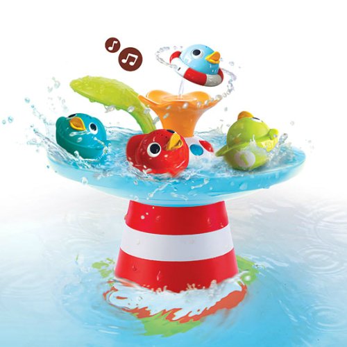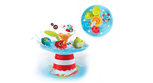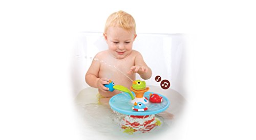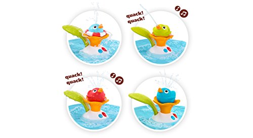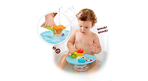 Baby bath toys from Yookidoo bring developmental toys and sensory development into the bathtub and make bath time fun! This musical duck race combines brilliant engineering with a magical sense of play to create a unique experience for your child. This battery operated fountain draws water up a specially designed pump and circulates water in a track at the top of the toy. The four mischievous ducks that come with this set can race around the fountain while fun water and sound effects play. At the top of the fountain more water will pump out, and your child can activate more sound effects by pressing down on the leaf. Each duck has a different color and water effect. The different aspects of the fountain develops hand-eye coordination, cause and effect, the properties of physics, and encourages learning through sensory play and also fun! Yookidoo's credo, Celebrating Discovery, is more than just a promise to you and your baby. It's the very essence of their approach to innovation in creating developmental toys that encourage your baby or toddler's personal developmental breakthrough. Conceived by the internationally renowned baby toys' team of Golos-Weisman Design, Yookidoo's exclusive products possesses a unique design language founded on extensive and ongoing observation of babies and infants and an in-depth understanding of their unique world. It's a world filled with stimulating challenges that babies encounter and Yookidoo tries to filter it through their perspective. More than toys, they are a path to awaken a child's sense of delight, wonder and accomplishment at learning to process the world. This musical fountain will be a hit for your child and encourage development and fun play during bath time.