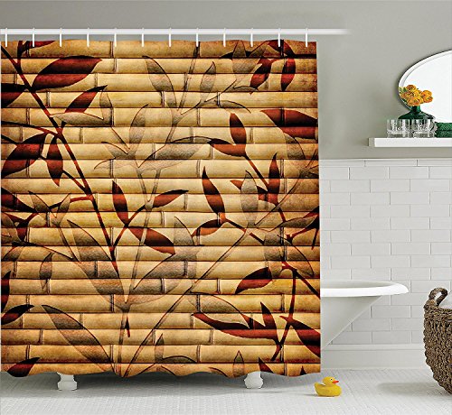 Beige Bamboo Shower Curtain, Bamboo Stems And Leaf Figures Over It Spiritual Asian Elements Boho Bathroom Accessories