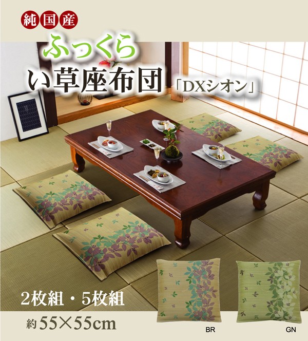 【商品名】 中わた1.5倍 純国産 捺染千鳥 い草座布団 『DXシオン 2枚組』 グリーン 55×55cm×2P 【ジャンル・特徴】 イ草 いぐさ イグサ 冷感 ひんやりマット ■サイズ・色違い・関連商品■2枚組 55×55cm ブラウン■2枚組 55×55cm グリーン[当ページ]■5枚組 55×55cm ブラウン■5枚組 55×55cm グリーン関連商品の検索結果一覧はこちら 職人が1枚1枚手作業で捺染プリントを施した人気のリーフ柄い草座布団です。中材にはメーカー比1.5倍の量のわたを使用しています。ふっくらフカフカとしたボリューム感をお楽しみ下さい。生地にはメセキ織りと呼ばれる織りを採用し、柔らかくさらっとした肌触りに仕上げました。国産(九州産)のい草を使用しています。一本一本が太く、表皮が厚く繊維がキメ細かいので弾力性があり、耐久性に優れています。い草には空気の自然浄化作用、湿度の調節作用などがあります。また汚れにくく、使用するうちに黄金色に変化し味が出ます。い草に青森ヒバ加工を施しています(抗菌、防臭効果)。※柄のプリントは職人が手作業で描く為、同じ色・柄であっても多少風合