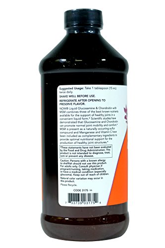 -. Binding : Misc. -. Brand : Now Foods -. Department : Health and Personal Care -. EAN : 0733739031754 -. Feature : NOW Liquid Glucosamine & Chondroitin with MSM combines three of the most effective nutrients available today for supporting good joint health in an easily absorbed liquid form / NOW Foods -. IsAdultProduct : 0 -. IsAutographed : 0 -. IsMemorabilia : 0 -. Label : NOW Foods -. LegalDisclaimer : These statements have not been evaluated by the Food & Drug Administration. This products is not intended to diagnose, cure, mitigate, treat, or prevent any disease. -. Manufacturer : NOW Foods -. Model : 733739031754 -. MPN : 3175 -. NumberOfItems : 1 -. PackageQuantity : 1 -. PartNumber : 3175 -. ProductGroup : Health and Beauty -. ProductTypeName : GROCERY -. Publisher : NOW Foods -. Size : 16 -. Studio : NOW Foods -. Title : NOW Foods Liquid Glucosamine & Chondroitin with MSM Citrus -- 16 fl oz -. UPC : 733739031754