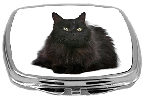 Rikki Knight Fluffy Black Cat on White with Yellow Bright Eyes Design Compact Mirror, 17 Ounce