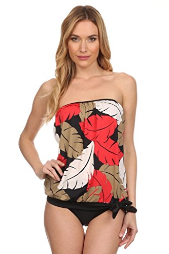 Feature : Bandeau blouson top with Sewn-in bra . Banded hemline with tie for adjustability. Conceals flowing midsection. / Top provides fitted support and includes removable straps for all day wear / Includes high waist lined bottom / 80% nylon, 20% spandex / Made in USA