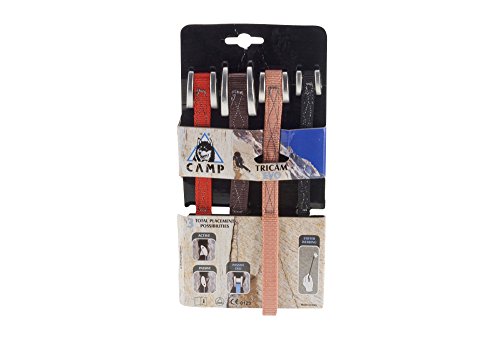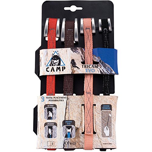Studio : Camp Usa Publisher : Camp Usa Product Description FEATURES of the Camp USA Tricam Evo Three (yes, that's one additional!) placement modes: active cam and 2 passive chocks Works where nothing else can fit, such as solution pockets Excellent in horizontal cracks Features new, stiffer sewing on the slings for easier one-handed placement and extraction 0